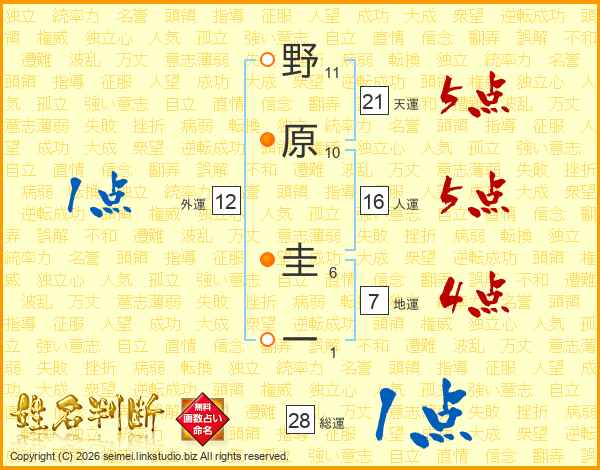 野(11画)原(10画) 圭(6画)一(1画)