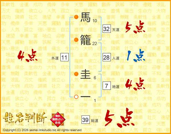 生活面を象徴する運勢です。外部から受ける影響力を表し、結婚運、家庭運や職場、環境への順応性を表します。総運から人運を引いた画数。姓や名が1文字の場合を除く。