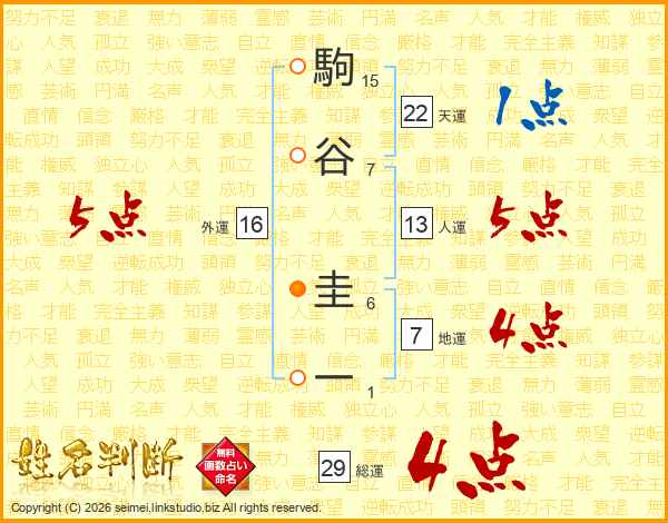 駒(15画)谷(7画) 圭(6画)一(1画)
