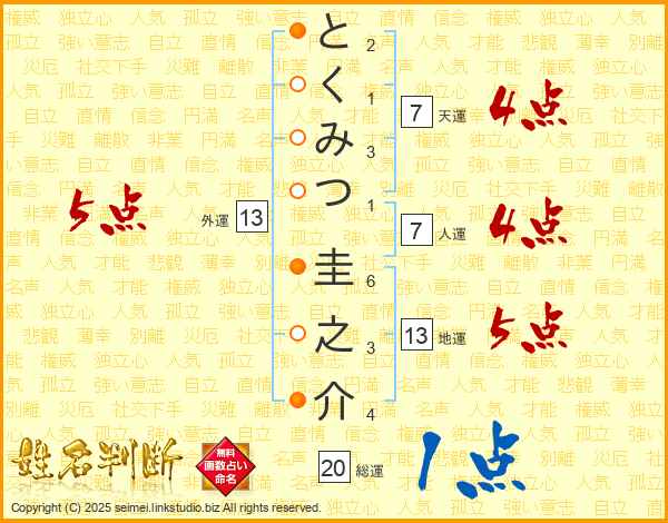 と(2画)く(1画)み(3画)つ(1画) 圭(6画)之(3画)介(4画)