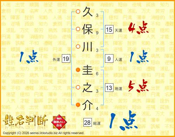 久(3画)保(9画)川(3画) 圭(6画)之(3画)介(4画)