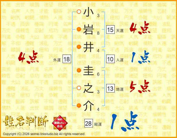 小(3画)岩(8画)井(4画) 圭(6画)之(3画)介(4画)
