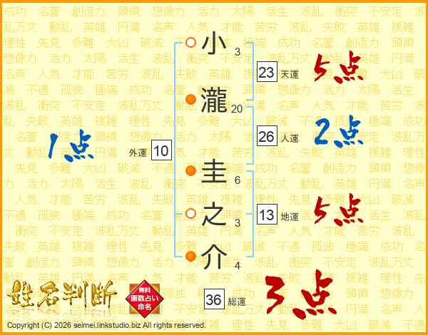 小瀧圭之介さんの天運は23画の5点!