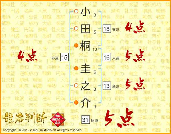 小(3画)田(5画)桐(10画) 圭(6画)之(3画)介(4画)