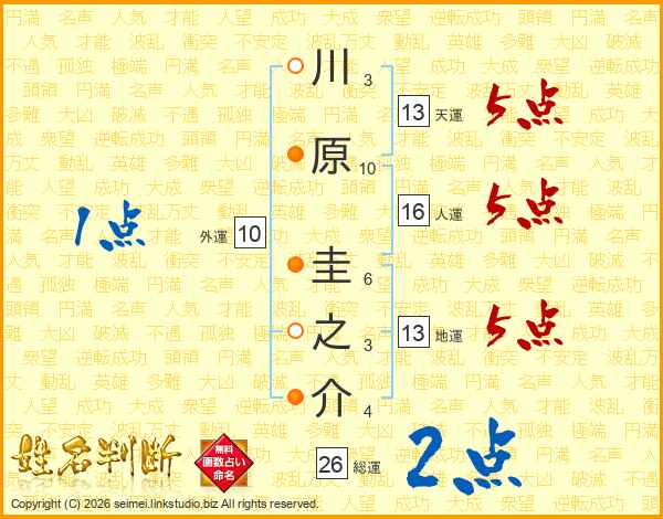 川(3画)原(10画) 圭(6画)之(3画)介(4画)