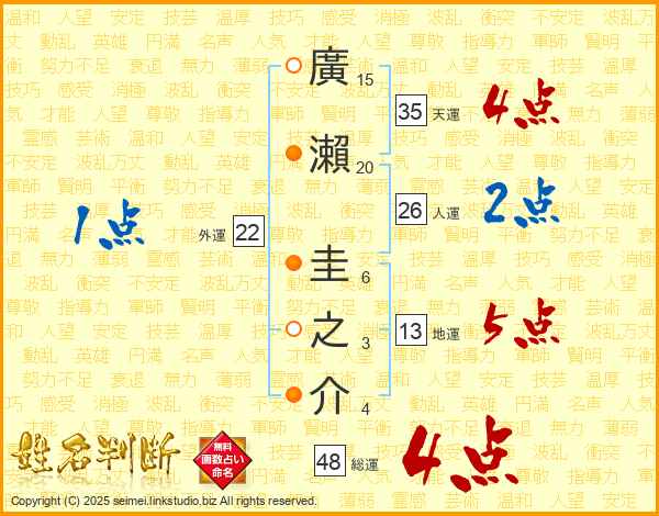 廣(15画)瀨(20画) 圭(6画)之(3画)介(4画)