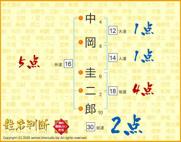 中(4画)岡(8画) 圭(6画)二(2画)郎(10画)