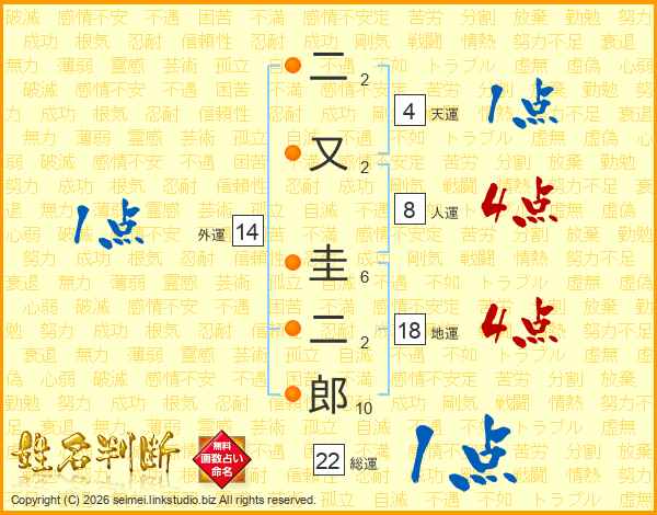 生活面を象徴する運勢です。外部から受ける影響力を表し、結婚運、家庭運や職場、環境への順応性を表します。総運から人運を引いた画数。姓や名が1文字の場合を除く。
