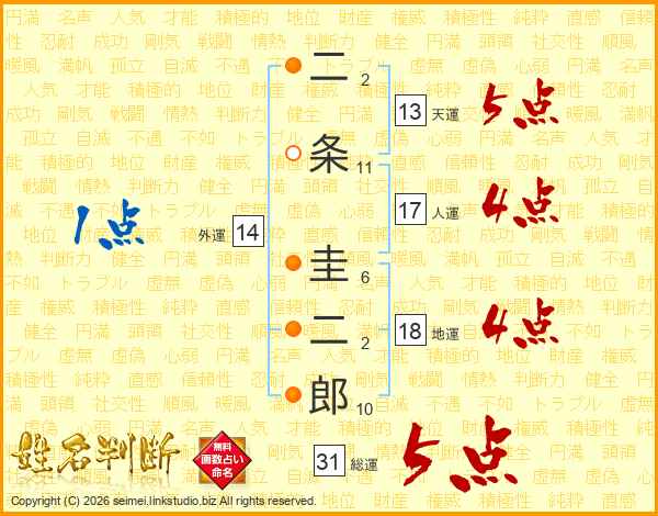 二条圭二郎さんの総運は31画の5点!