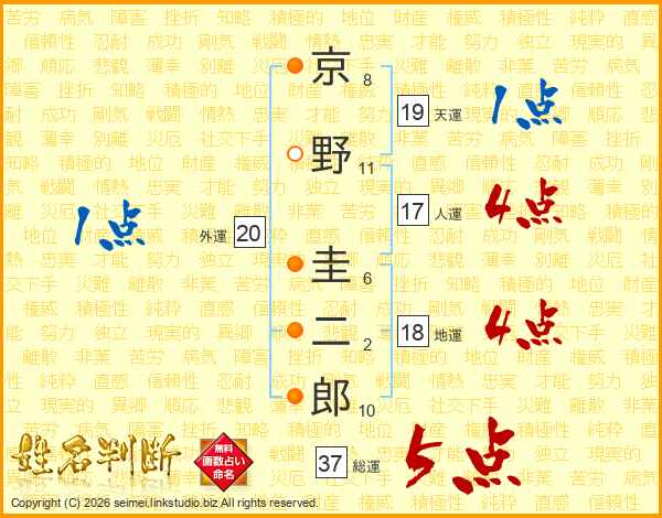 京(8画)野(11画) 圭(6画)二(2画)郎(10画)