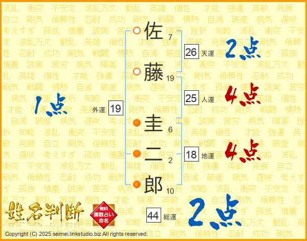 佐(7画)藤(19画) 圭(6画)二(2画)郎(10画)