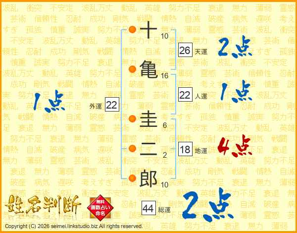 十(10画)亀(16画) 圭(6画)二(2画)郎(10画)