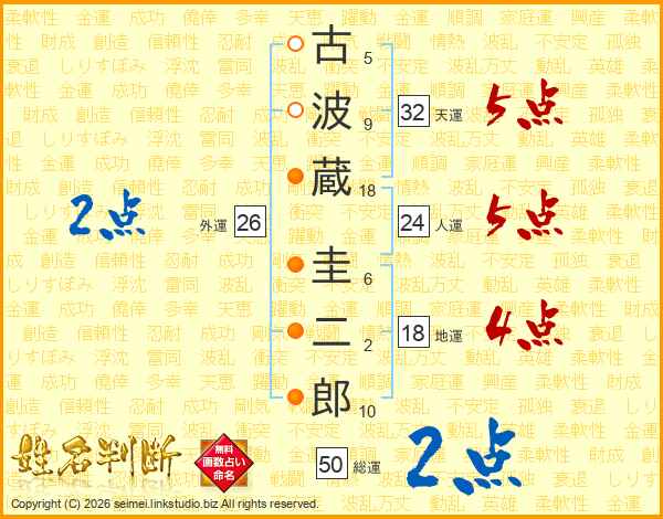 古(5画)波(9画)蔵(18画) 圭(6画)二(2画)郎(10画)