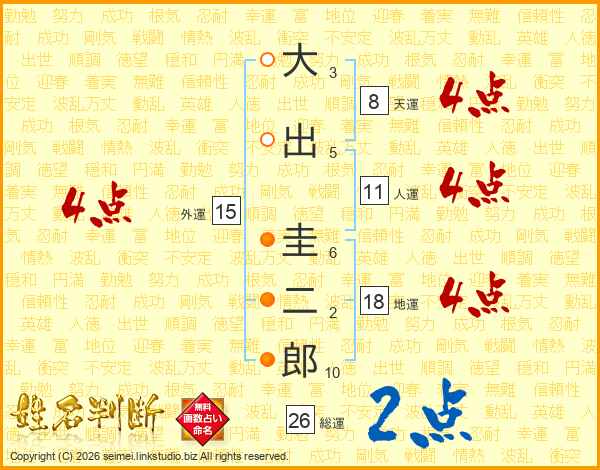 大(3画)出(5画) 圭(6画)二(2画)郎(10画)