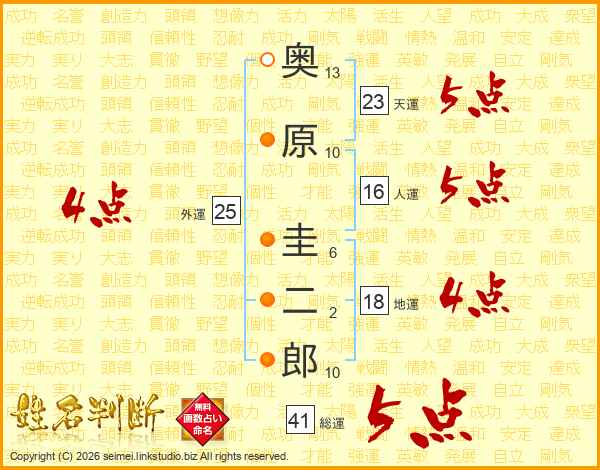 奥原圭二郎さんの総運は41画の5点!