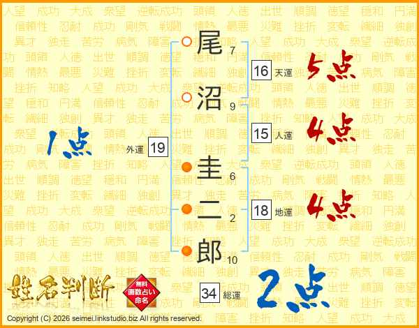 尾(7画)沼(9画) 圭(6画)二(2画)郎(10画)