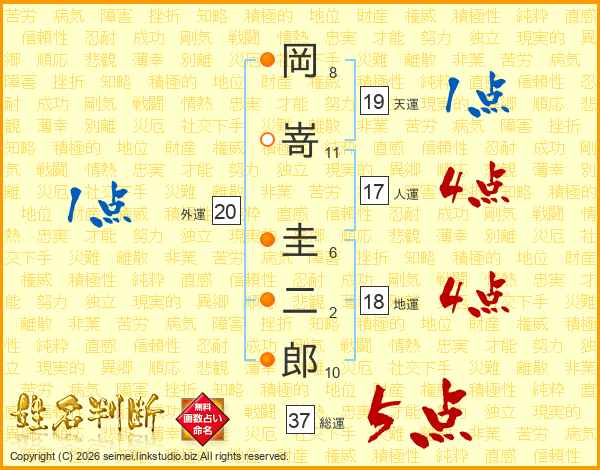 岡(8画)嵜(11画) 圭(6画)二(2画)郎(10画)