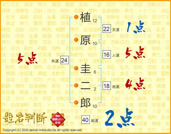 植(12画)原(10画) 圭(6画)二(2画)郎(10画)