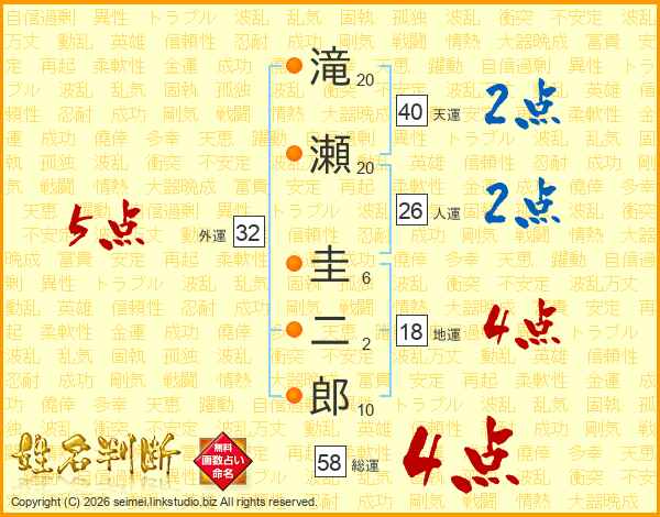 滝(20画)瀬(20画) 圭(6画)二(2画)郎(10画)