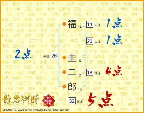 生活面を象徴する運勢です。外部から受ける影響力を表し、結婚運、家庭運や職場、環境への順応性を表します。総運から人運を引いた画数。姓や名が1文字の場合を除く。