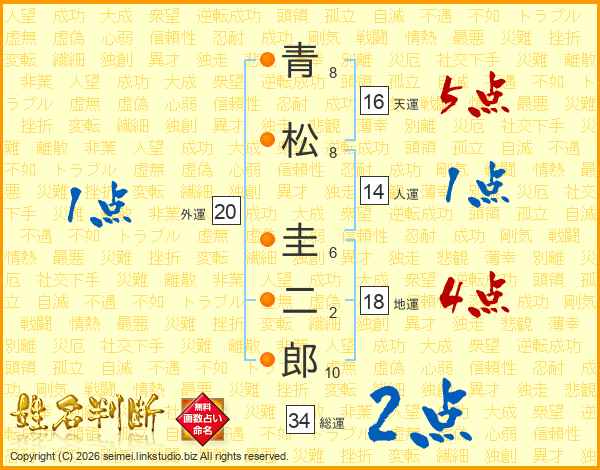 青(8画)松(8画) 圭(6画)二(2画)郎(10画)