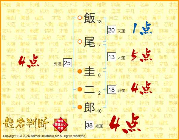飯(13画)尾(7画) 圭(6画)二(2画)郎(10画)