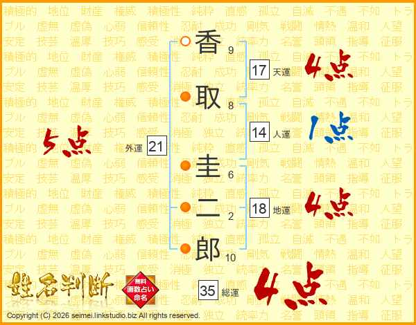 香(9画)取(8画) 圭(6画)二(2画)郎(10画)