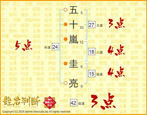 五(5画)十(10画)嵐(12画) 圭(6画)亮(9画)