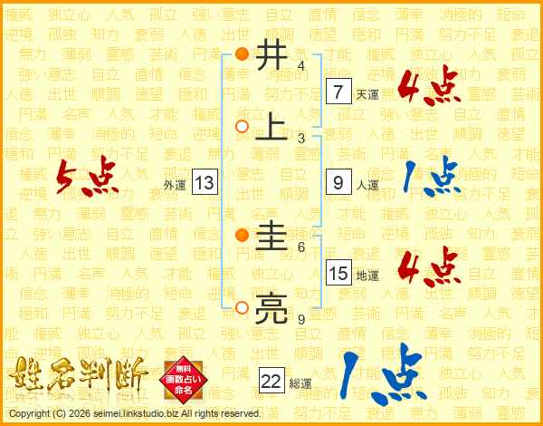 生活面を象徴する運勢です。外部から受ける影響力を表し、結婚運、家庭運や職場、環境への順応性を表します。総運から人運を引いた画数。姓や名が1文字の場合を除く。