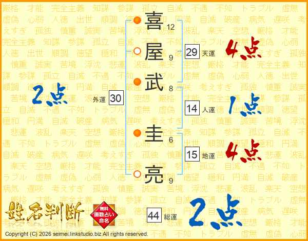 喜(12画)屋(9画)武(8画) 圭(6画)亮(9画)