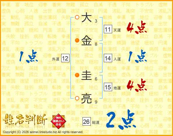 生活面を象徴する運勢です。外部から受ける影響力を表し、結婚運、家庭運や職場、環境への順応性を表します。総運から人運を引いた画数。姓や名が1文字の場合を除く。