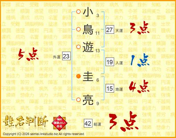 小(3画)鳥(11画)遊(13画) 圭(6画)亮(9画)