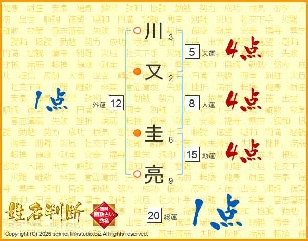 生活面を象徴する運勢です。外部から受ける影響力を表し、結婚運、家庭運や職場、環境への順応性を表します。総運から人運を引いた画数。姓や名が1文字の場合を除く。