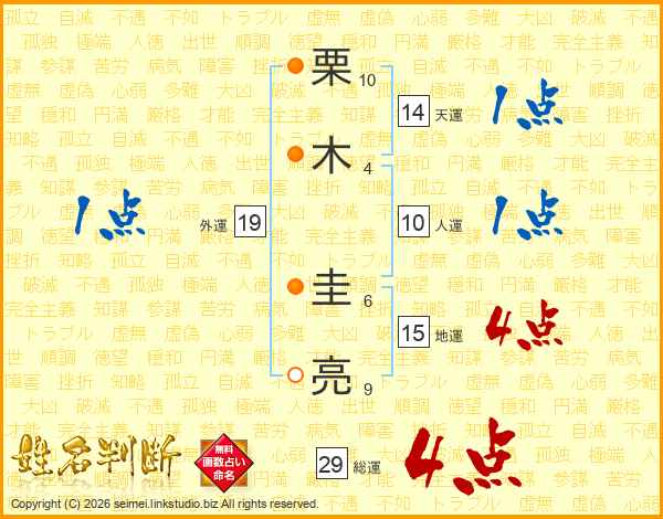 栗(10画)木(4画) 圭(6画)亮(9画)