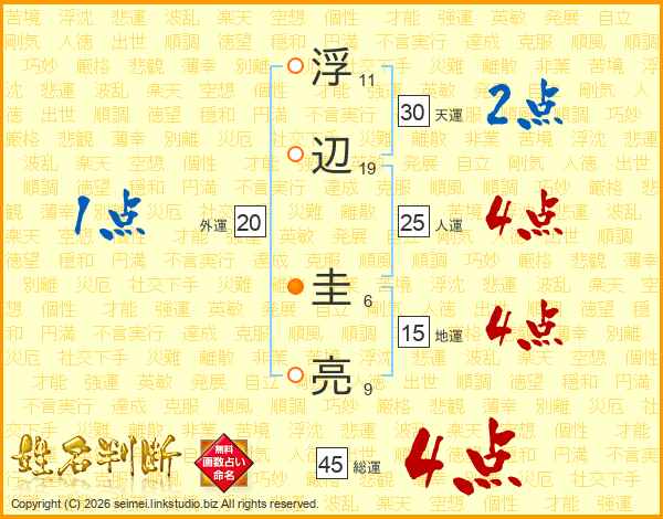 浮(11画)辺(19画) 圭(6画)亮(9画)