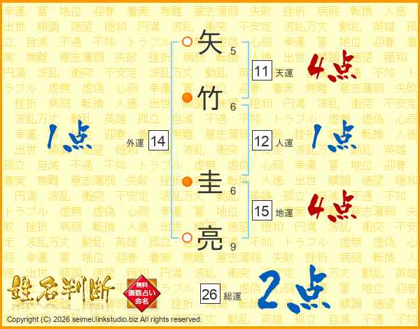 生活面を象徴する運勢です。外部から受ける影響力を表し、結婚運、家庭運や職場、環境への順応性を表します。総運から人運を引いた画数。姓や名が1文字の場合を除く。