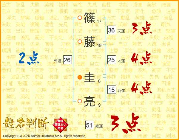 篠(17画)藤(19画) 圭(6画)亮(9画)
