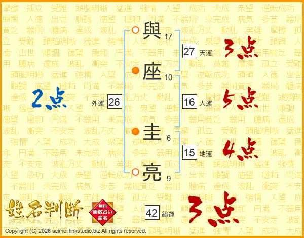 與(17画)座(10画) 圭(6画)亮(9画)