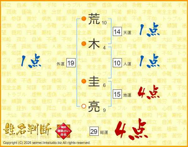 荒(10画)木(4画) 圭(6画)亮(9画)