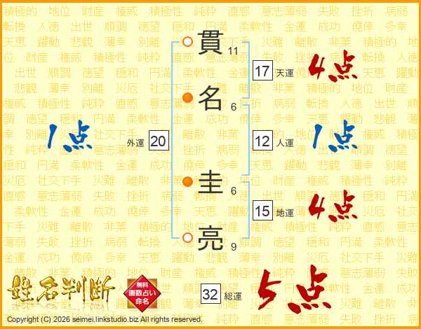 貫(11画)名(6画) 圭(6画)亮(9画)