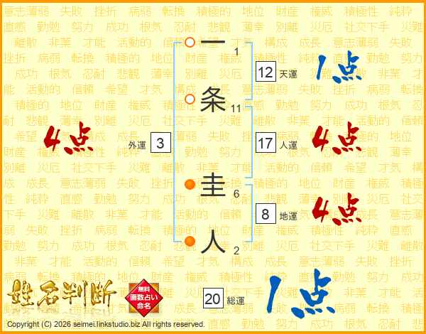 生活面を象徴する運勢です。外部から受ける影響力を表し、結婚運、家庭運や職場、環境への順応性を表します。総運から人運を引いた画数。姓や名が1文字の場合を除く。