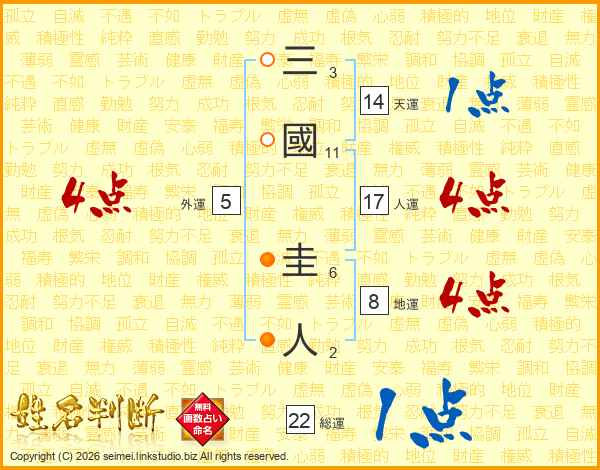 生活面を象徴する運勢です。外部から受ける影響力を表し、結婚運、家庭運や職場、環境への順応性を表します。総運から人運を引いた画数。姓や名が1文字の場合を除く。