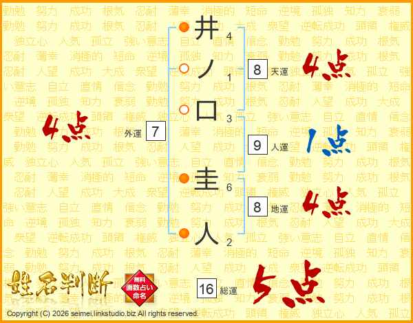 井(4画)ノ(1画)口(3画) 圭(6画)人(2画)