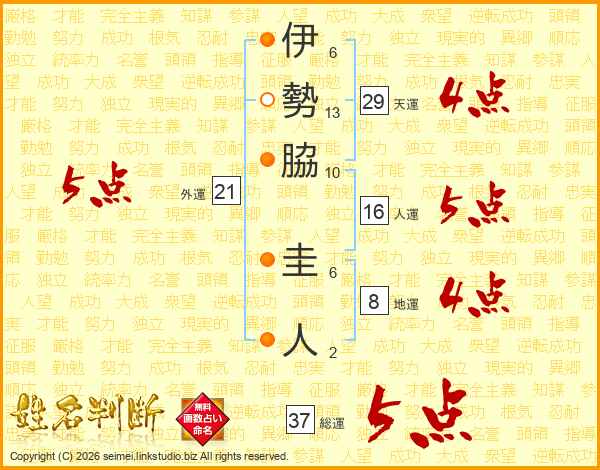 伊勢脇圭人さんの総運は37画の5点!