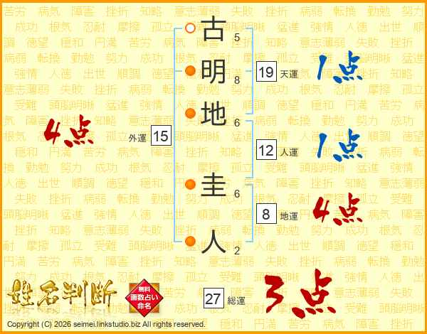 古(5画)明(8画)地(6画) 圭(6画)人(2画)