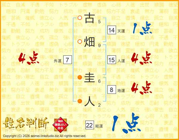 生活面を象徴する運勢です。外部から受ける影響力を表し、結婚運、家庭運や職場、環境への順応性を表します。総運から人運を引いた画数。姓や名が1文字の場合を除く。
