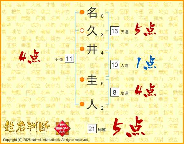 名(6画)久(3画)井(4画) 圭(6画)人(2画)