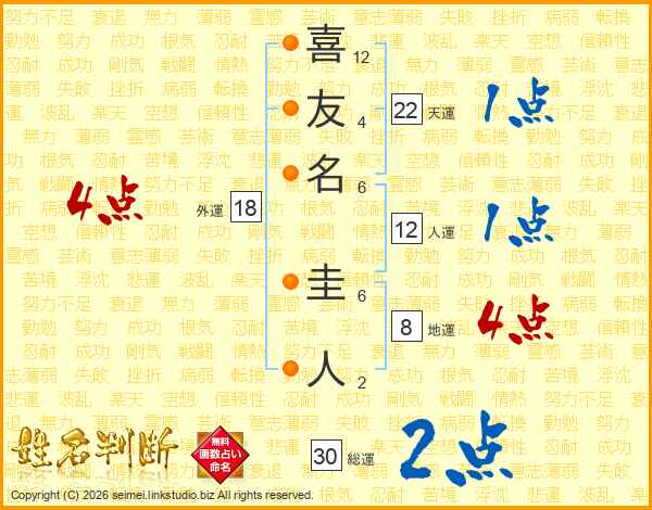 喜(12画)友(4画)名(6画) 圭(6画)人(2画)
