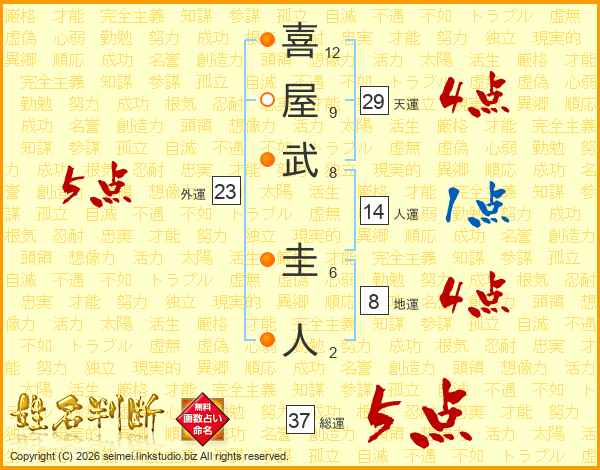 喜(12画)屋(9画)武(8画) 圭(6画)人(2画)