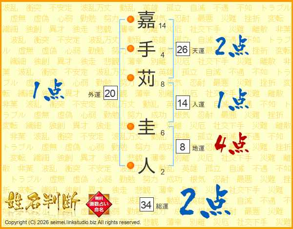 嘉(14画)手(4画)苅(8画) 圭(6画)人(2画)